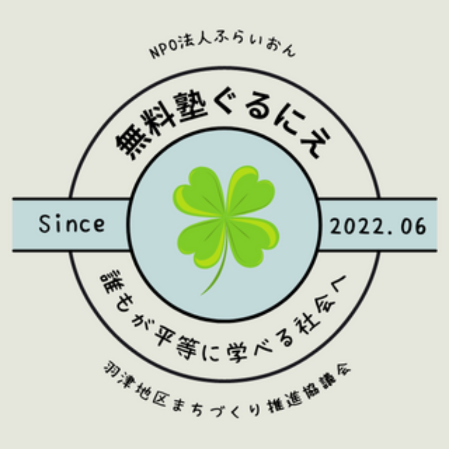 無料塾ぐるにえは、「NPO法人ふらいおん」と「羽津地区まちづくり推進協議会」の方々に協力していただきながら運営しています。